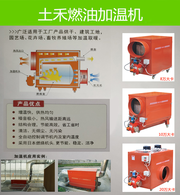 广泛适用于工厂产品烘干、建筑工地,园艺场、花卉场、畜牧养殖场等加温取暖。
